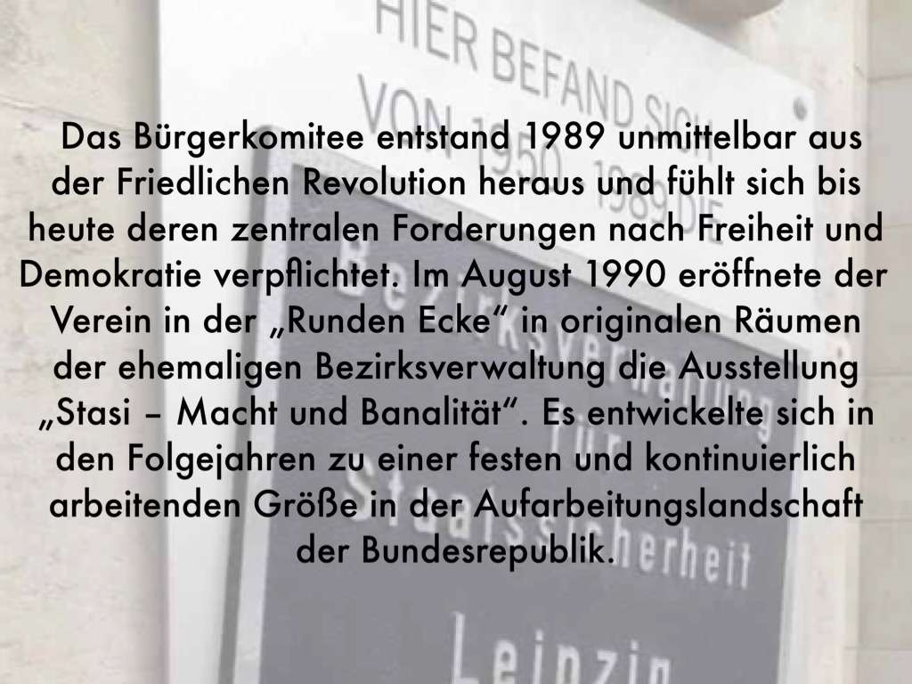 Das Bürgerkomitee entstand 1989 unmittelbar aus der Friedlichen Revolution heraus und fühlt sich bis heute deren zentralen Forderungen nach Freiheit und Demokratie verpflichtet. Im August 1990 eröffnete der Verein in der „Runden Ecke“ in originalen Räumen der ehemaligen Bezirksverwaltung die Ausstellung „Stasi – Macht und Banalität“. Es entwickelte sich in den Folgejahren zu einer festen und kontinuierlich arbeitenden Größe in der Aufarbeitungslandschaft der Bundesrepublik.
