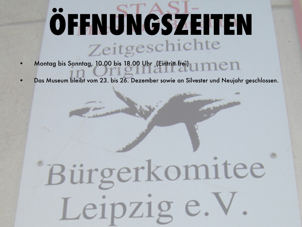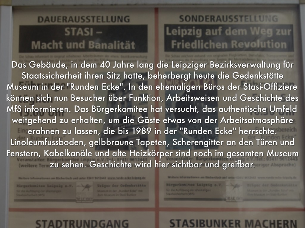 Das Gebäude, in dem 40 Jahre lang die Leipziger Bezirksverwaltung für Staatssicherheit ihren Sitz hatte, beherbergt heute die Gedenkstätte Museum in der "Runden Ecke". In den ehemaligen Büros der Stasi-Offiziere können sich nun Besucher über Funktion, Arbeitsweisen und Geschichte des MfS informieren. Das Bürgerkomitee hat versucht, das authentische Umfeld weitgehend zu erhalten, um die Gäste etwas von der Arbeitsatmosphäre erahnen zu lassen, die bis 1989 in der "Runden Ecke" herrschte. Linoleumfussboden, gelbbraune Tapeten, Scherengitter an den Türen und Fenstern, Kabelkanäle und alte Heizkörper sind noch im gesamten Museum zu sehen. Geschichte wird hier sichtbar und greifbar.