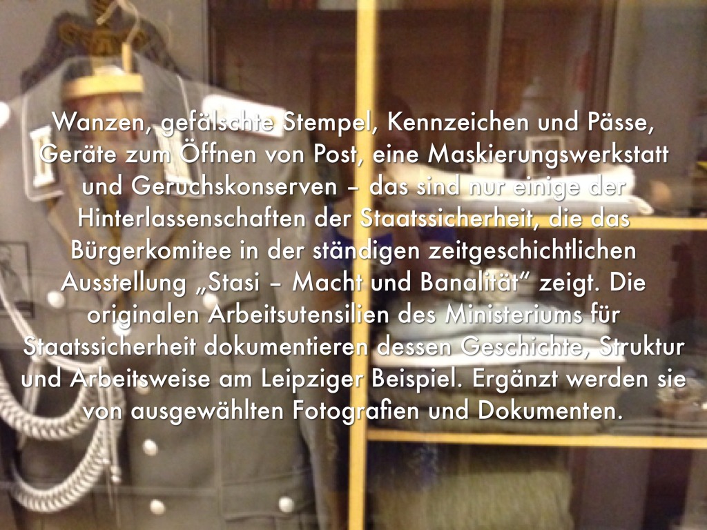 Wanzen, gefälschte Stempel, Kennzeichen und Pässe, Geräte zum Öffnen von Post, eine Maskierungswerkstatt und Geruchskonserven – das sind nur einige der Hinterlassenschaften der Staatssicherheit, die das Bürgerkomitee in der ständigen zeitgeschichtlichen Ausstellung „Stasi – Macht und Banalität“ zeigt. Die originalen Arbeitsutensilien des Ministeriums für Staatssicherheit dokumentieren dessen Geschichte, Struktur und Arbeitsweise am Leipziger Beispiel. Ergänzt werden sie von ausgewählten Fotografien und Dokumenten.