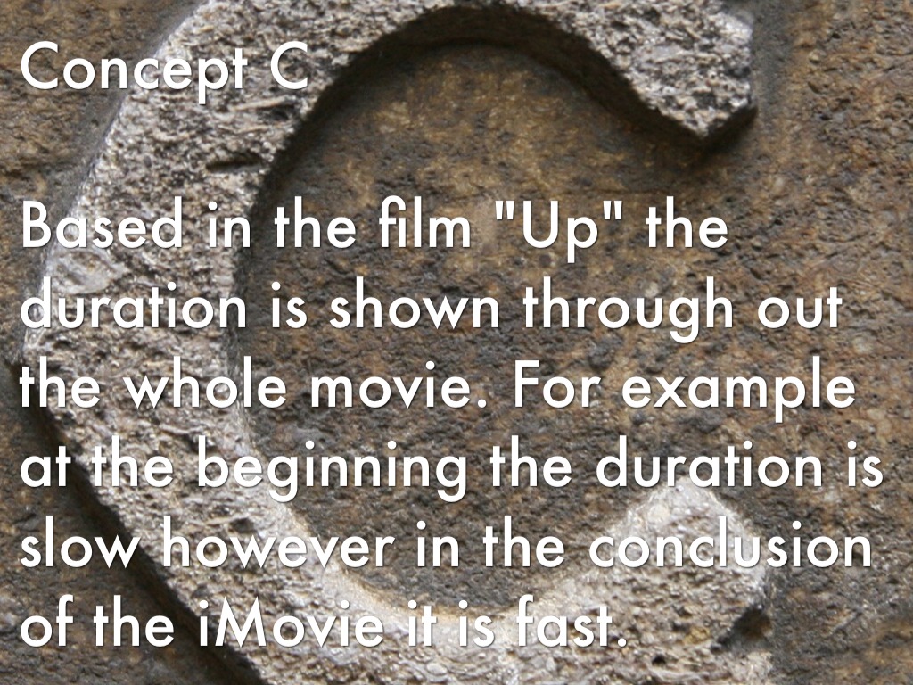 Based in the film "Up" the duration is shown through out the whole movie. For example at the beginning the duration is slow however in the conclusion of the iMovie it is fast.