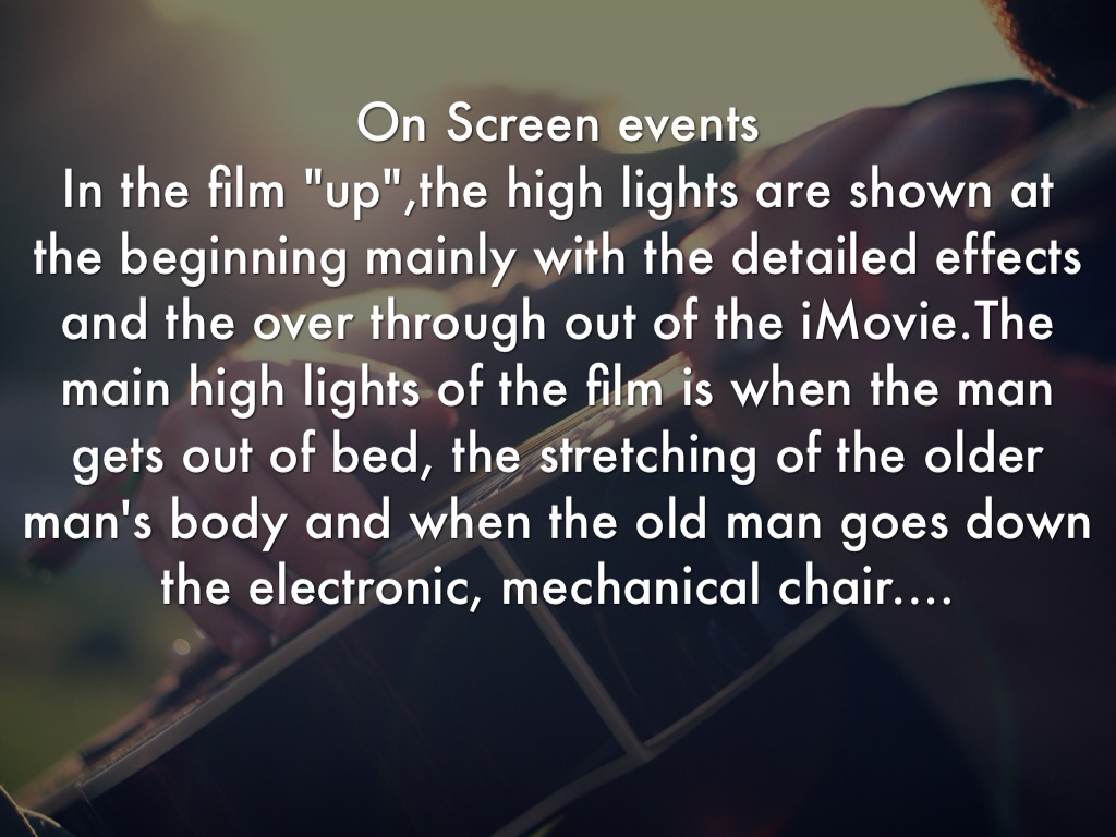 On Screen events In the film "up",the high lights are shown at the beginning mainly with the detailed effects and the over through out of the iMovie.The main high lights of the film is when the man gets out of bed, the stretching of the older man's body and when the old man goes down the electronic, mechanical chair.