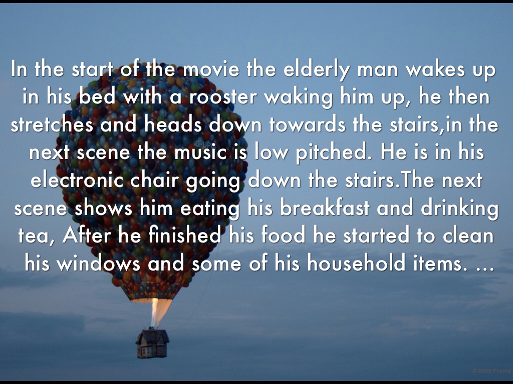 In the start of the movie the elderly man wakes up in his bed with a rooster waking him up, he then stretches and heads down towards the stairs,in the next scene the music is low pitched. He is in his electronic chair going down the stairs.The next scene shows him eating his breakfast and drinking tea, After he finished his food he started to clean his windows and some of his household items.