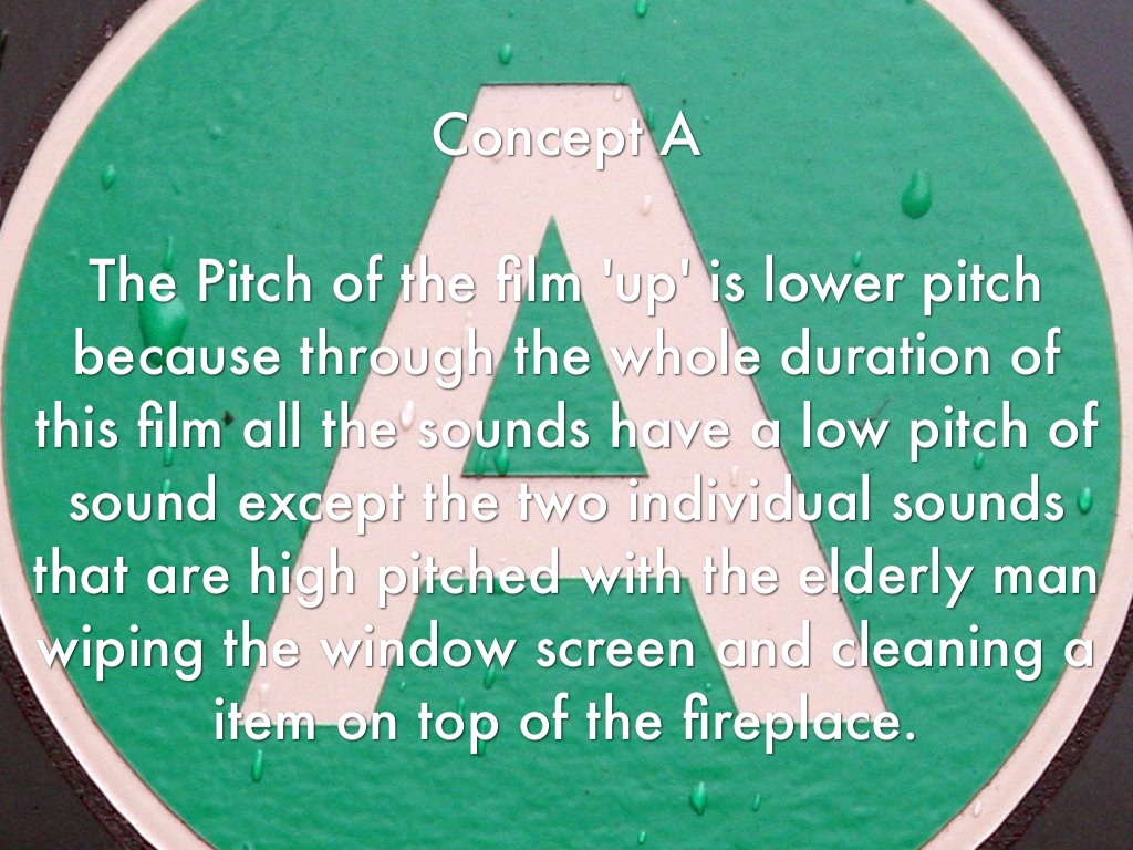 Concept analysis: Through out the film our sound was shown in the pitch by using sounds such as the high pitch rooster, the high pitch mechanical chair, the low to high pitch rubbing of the window and much more.