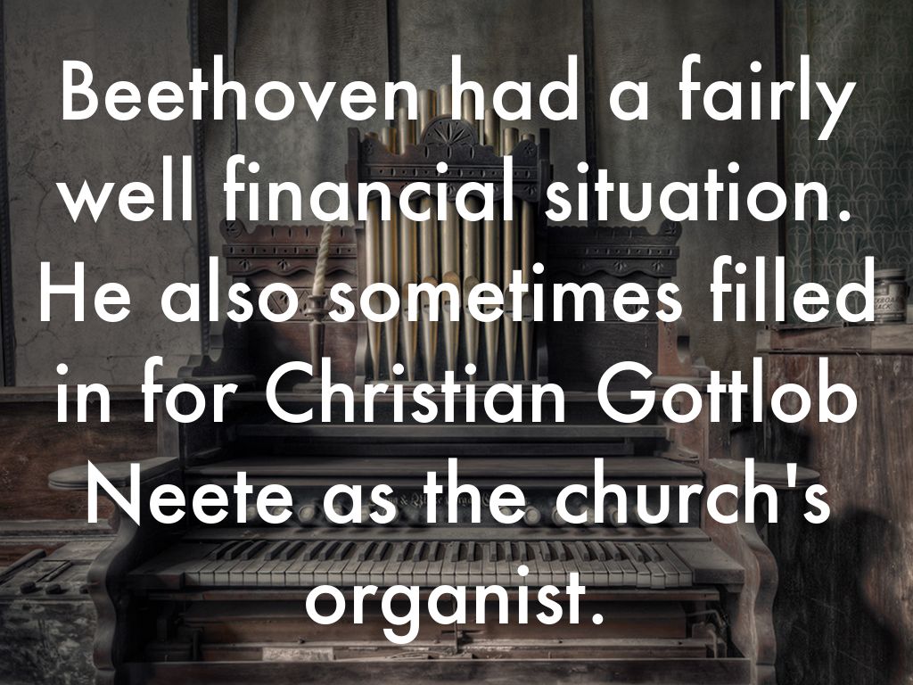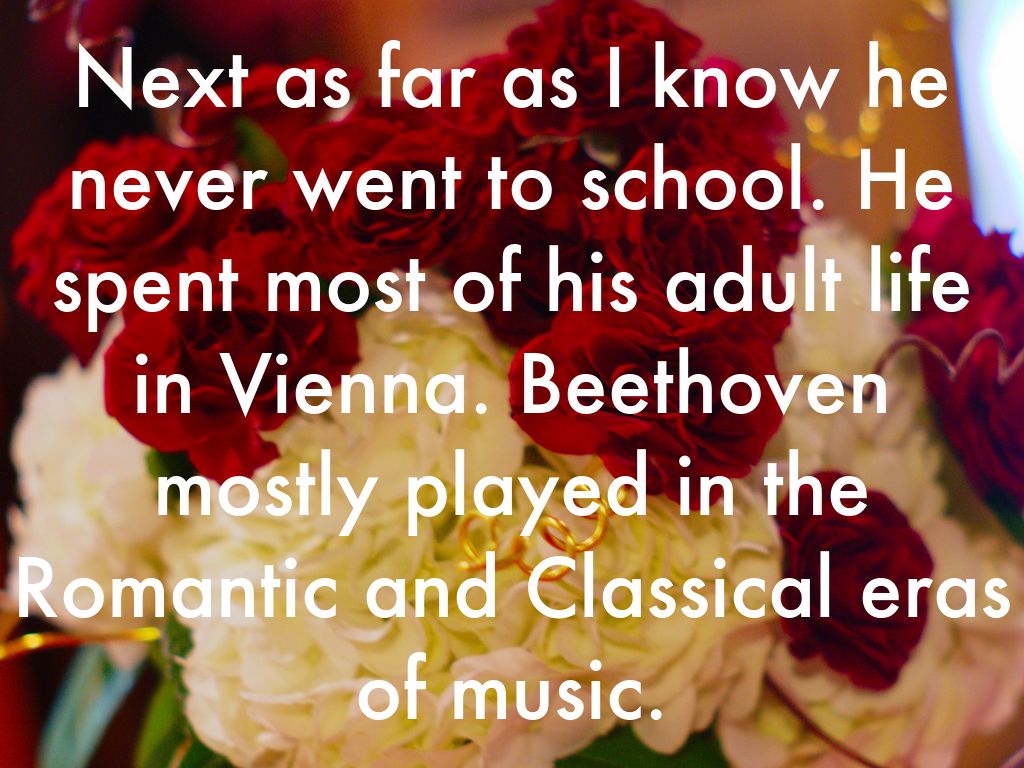 Next as far as I know he never went to school. He spent most of his adult life in Vienna. Beethoven mostly played in the Romantic and Classical eras of music.