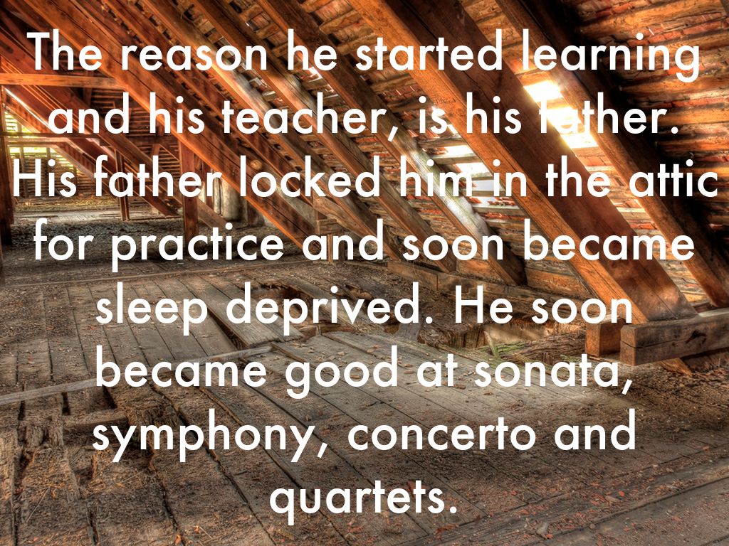 The reason he started learning and his teacher, is his father. His father locked him in the attic for practice and soon became sleep deprived. He soon became good at sonata, symphony, concerto and quartets.