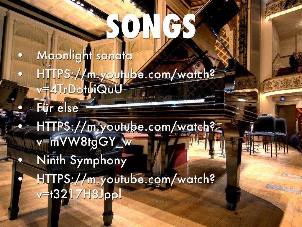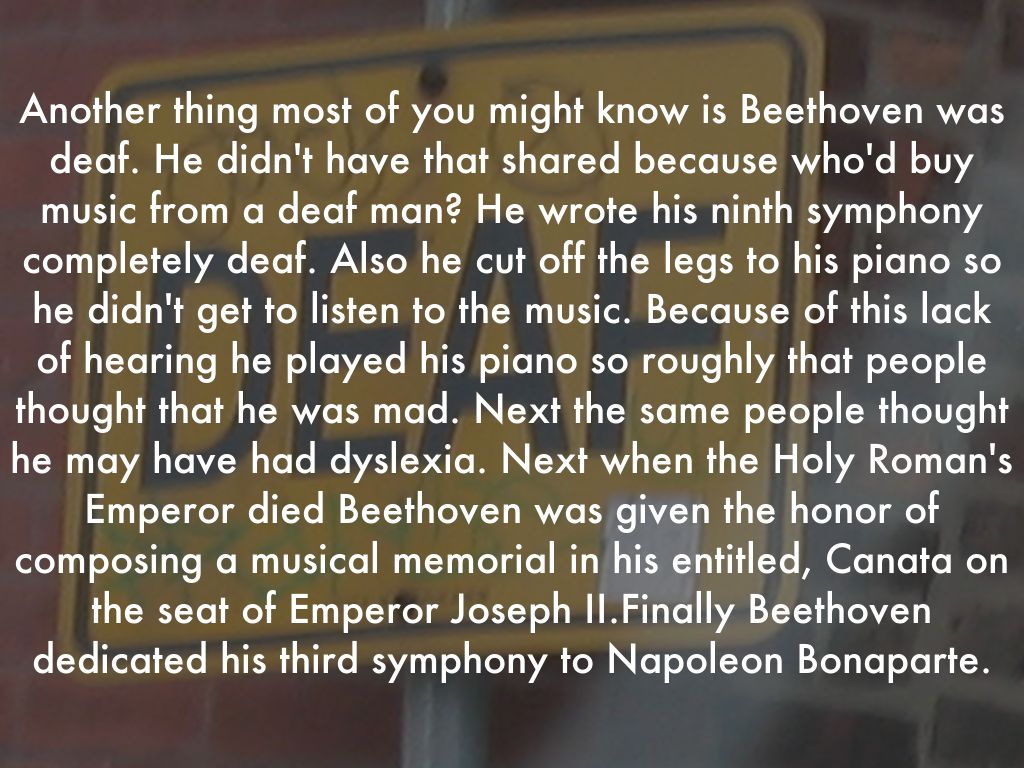 Another thing most of you might know is Beethoven was deaf. He didn't have that shared because who'd buy music from a deaf man? He wrote his ninth symphony completely deaf. Also he cut off the legs to his piano so he didn't get to listen to the music. Because of this lack of hearing he played his piano so roughly that people thought that he was mad. Next the same people thought he may have had dyslexia. Next when the Holy Roman's Emperor died Beethoven was given the honor of composing a musical memorial in his entitled, Canata on the seat of Emperor Joseph II.Finally Beethoven dedicated his third symphony to Napoleon Bonaparte.