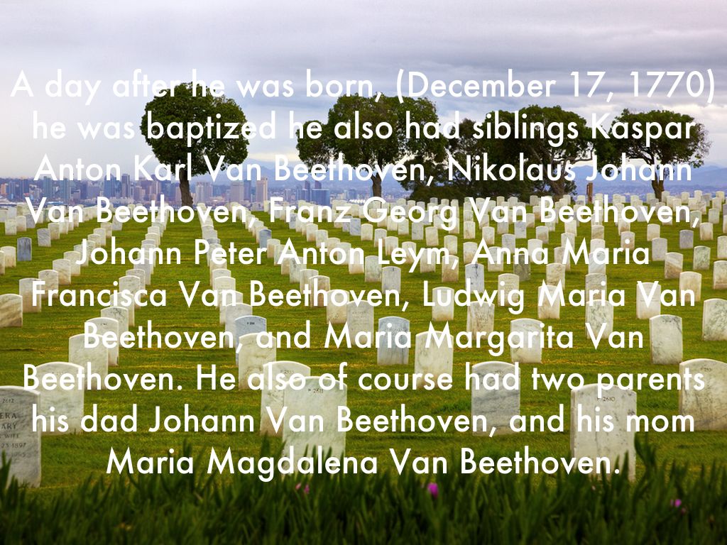 A day after he was born, (December 17, 1770) he was baptized he also had siblings Kaspar Anton Karl Van Beethoven, Nikolaus Johann Van Beethoven, Franz Georg Van Beethoven, Johann Peter Anton Leym, Anna Maria Francisca Van Beethoven, Ludwig Maria Van Beethoven, and Maria Margarita Van Beethoven. He also of course had two parents his dad Johann Van Beethoven, and his mom Maria Magdalena Van Beethoven.