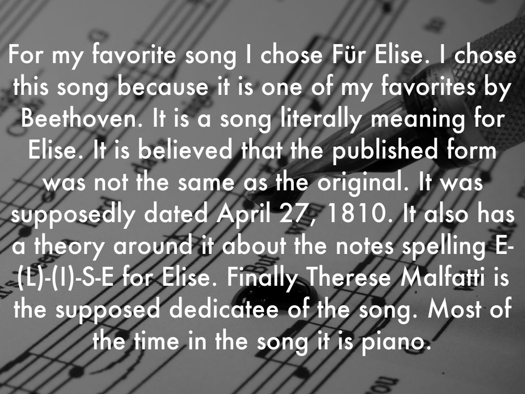 For my favorite song I chose Für Elise. I chose this song because it is one of my favorites by Beethoven. It is a song literally meaning for Elise. It is believed that the published form was not the same as the original. It was supposedly dated April 27, 1810. It also has a theory around it about the notes spelling E-(L)-(I)-S-E for Elise. Finally Therese Malfatti is the supposed dedicatee of the song. Most of the time in the song it is piano.