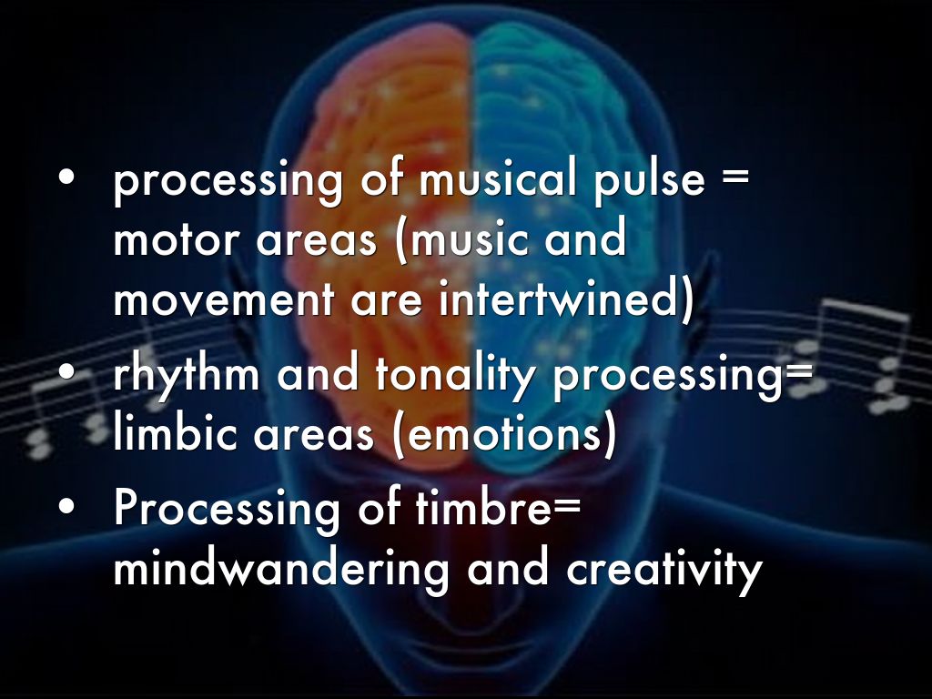 - processing of musical pulse = motor areas (music and movement are intertwined)