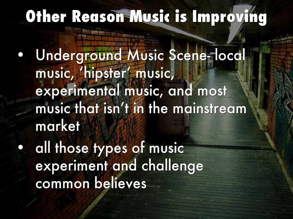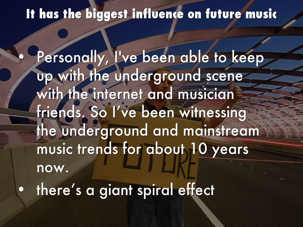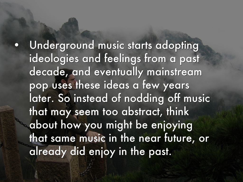 Underground music starts adopting ideologies and feelings from a past decade, and eventually mainstream pop uses these ideas a few years later. So instead of nodding off music that may seem too abstract, think about how you might be enjoying that same music in the near future, or already did enjoy in the past.