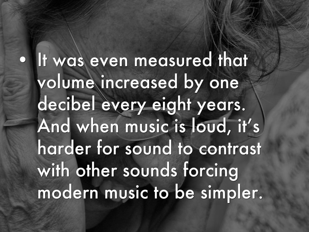 It was even measured that volume increased by one decibel every eight years. And when music is loud, it’s harder for sound to contrast with other sounds forcing modern music to be simpler.