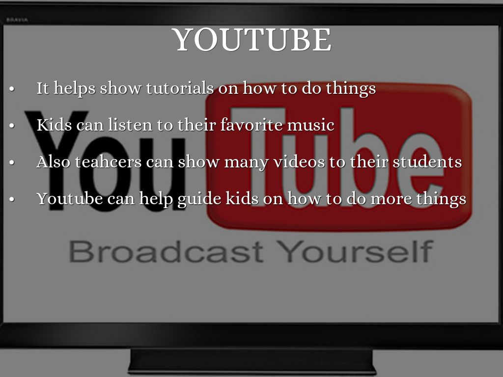 Youtube is a place where people can look at tutorials for things and they can look up their favorite music. Kids who need tutorials on things can use Youtube because it is filled with everything!