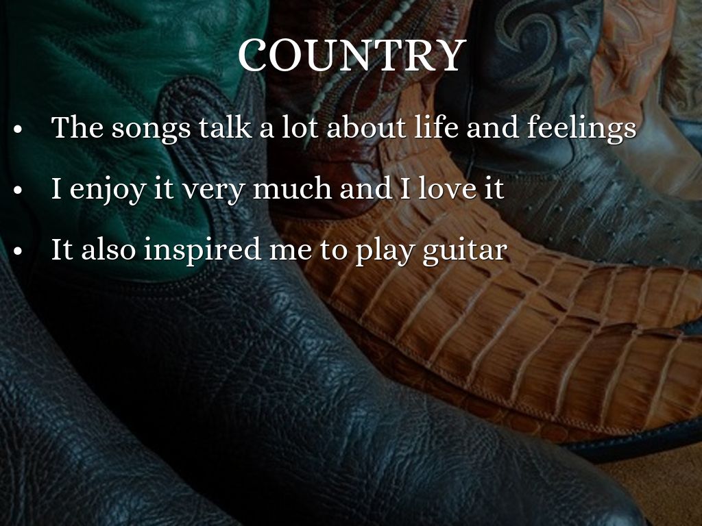 Country music is something that helps people through life and some country songs help people study easier and helps them learn things on people.
