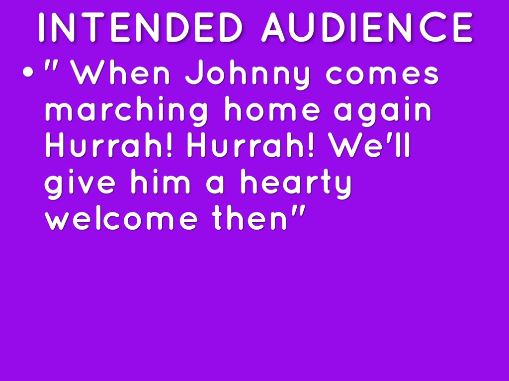 • " When Johnny comes marching home again Hurrah! Hurrah! We'll give him a hearty welcome then"