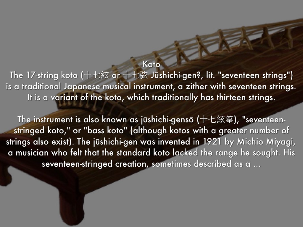 The instrument is also known as jūshichi-gensō (十七絃箏), "seventeen-stringed koto," or "bass koto" (although kotos with a greater number of strings also exist). The jūshichi-gen was invented in 1921 by Michio Miyagi, a musician who felt that the standard koto lacked the range he sought. His seventeen-stringed creation, sometimes described as a …
