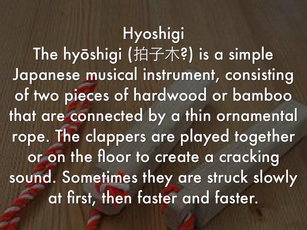 The hyōshigi (拍子木?) is a simple Japanese musical instrument, consisting of two pieces of hardwood or bamboo that are connected by a thin ornamental rope. The clappers are played together or on the floor to create a cracking sound. Sometimes they are struck slowly at first, then faster and faster.