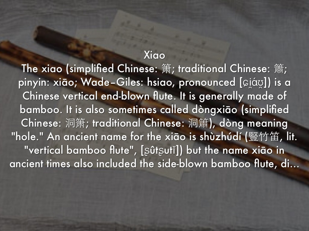 The xiao (simplified Chinese: 箫; traditional Chinese: 簫; pinyin: xiāo; Wade–Giles: hsiao, pronounced [ɕi̯ɑ́ʊ̯]) is a Chinese vertical end-blown flute. It is generally made of bamboo. It is also sometimes called dòngxiāo (simplified Chinese: 洞箫; traditional Chinese: 洞簫), dòng meaning "hole." An ancient name for the xiāo is shùzhúdí (豎竹笛, lit. "vertical bamboo flute", [ʂûtʂutǐ]) but the name xiāo in ancient times also included the side-blown bamboo flute, dizi.