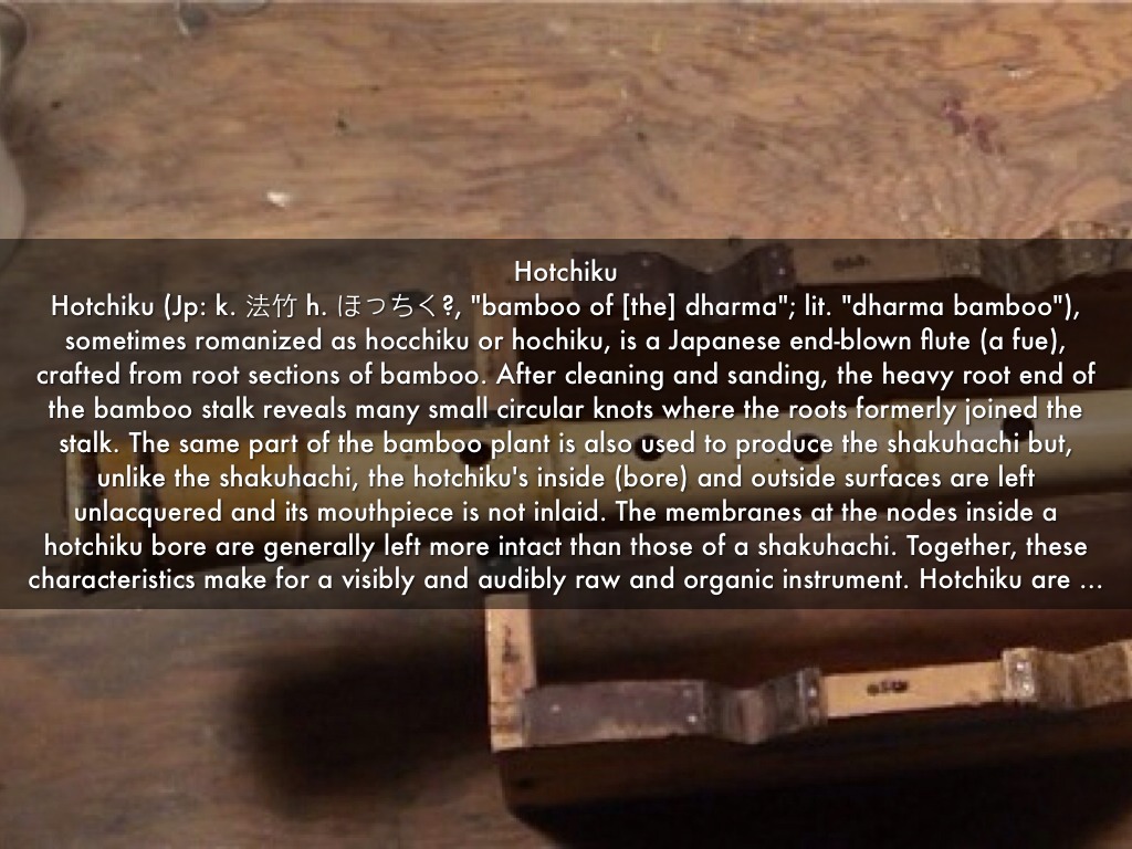 Hotchiku (Jp: k. 法竹 h. ほっちく?, "bamboo of [the] dharma"; lit. "dharma bamboo"), sometimes romanized as hocchiku or hochiku, is a Japanese end-blown flute (a fue), crafted from root sections of bamboo. After cleaning and sanding, the heavy root end of the bamboo stalk reveals many small circular knots where the roots formerly joined the stalk. The same part of the bamboo plant is also used to produce the shakuhachi but, unlike the shakuhachi, the hotchiku's inside (bore) and outside surfaces are left unlacquered and its mouthpiece is not inlaid. The membranes at the nodes inside a hotchiku bore are generally left more intact than those of a shakuhachi. Together, these characteristics make for a visibly and audibly raw and organic instrument. Hotchiku are sometimes referred to as jinashi nobekan, meaning "without ji (a paste made of clay and lacquer, used to smooth the bore on shakuhachi), one-piece" (hotchiku are not cut in two pieces for crafting or storage, unlike shakuhachi).