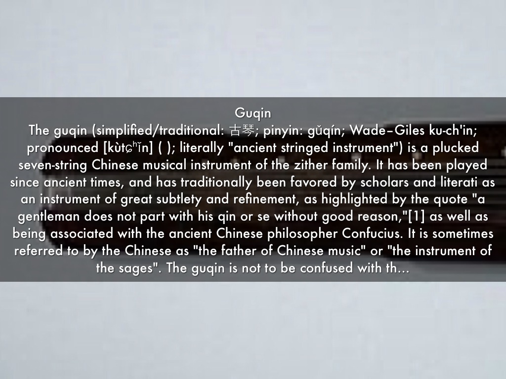 The guqin (simplified/traditional: 古琴; pinyin: gǔqín; Wade–Giles ku-ch'in; pronounced [kùtɕʰǐn] ( ); literally "ancient stringed instrument") is a plucked seven-string Chinese musical instrument of the zither family. It has been played since ancient times, and has traditionally been favored by scholars and literati as an instrument of great subtlety and refinement, as highlighted by the quote "a gentleman does not part with his qin or se without good reason,"[1] as well as being associated with the ancient Chinese philosopher Confucius. It is sometimes referred to by the Chinese as "the father of Chinese music" or "the instrument of the sages". The guqin is not to be confused with th…