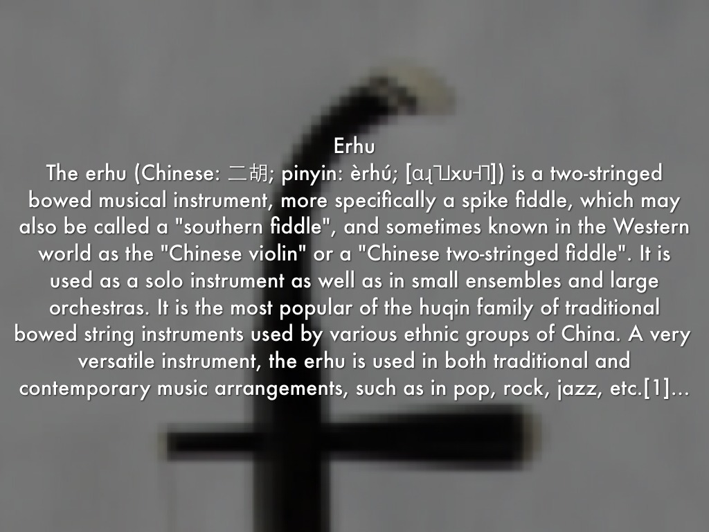 The erhu (Chinese: 二胡; pinyin: èrhú; [ɑɻ˥˩xu˧˥]) is a two-stringed bowed musical instrument, more specifically a spike fiddle, which may also be called a "southern fiddle", and sometimes known in the Western world as the "Chinese violin" or a "Chinese two-stringed fiddle". It is used as a solo instrument as well as in small ensembles and large orchestras. It is the most popular of the huqin family of traditional bowed string instruments used by various ethnic groups of China. A very versatile instrument, the erhu is used in both traditional and contemporary music arrangements, such as in pop, rock, jazz, etc.[1]…