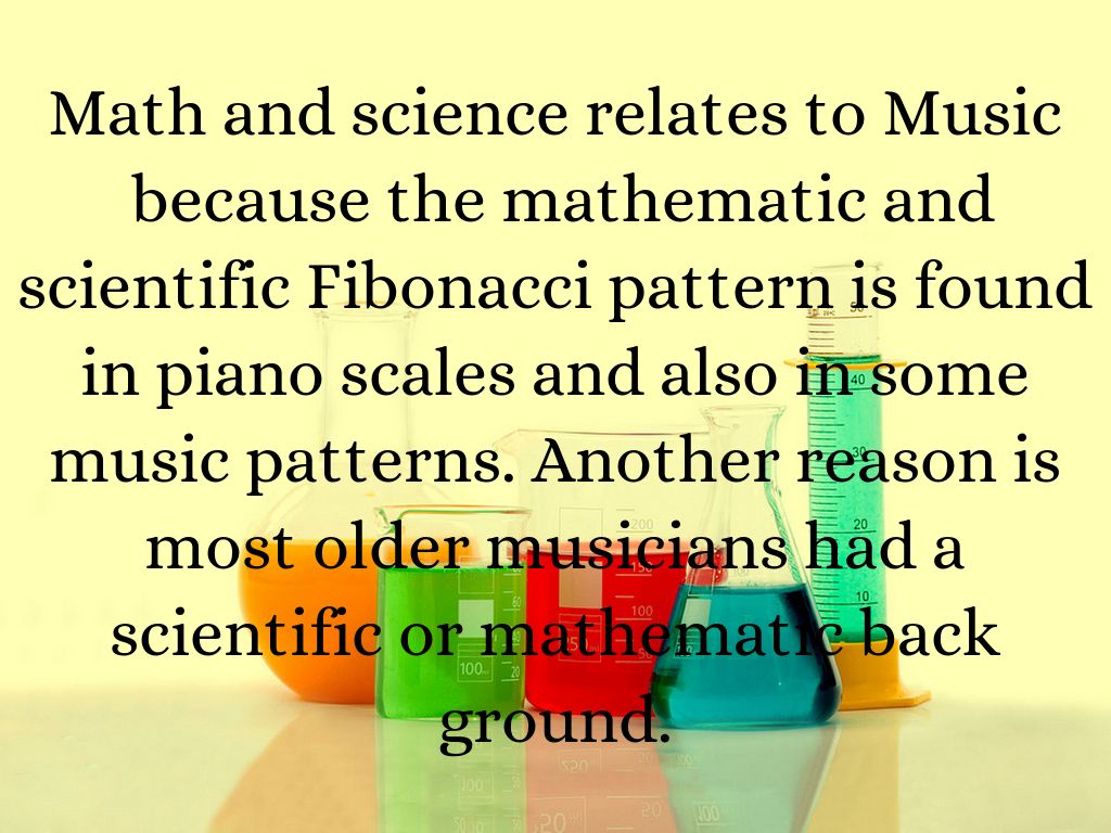 Math and science relates to Music because the mathematic and scientific Fibonacci pattern is found in piano scales and also in some music patterns. Another reason is most older musicians had a scientific or mathematic back ground.