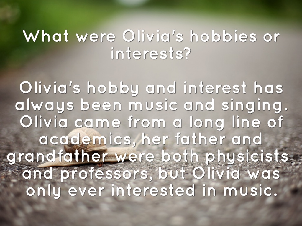 Olivia's hobby and interest has always been music and singing. Olivia came from a long line of academics, her father and grandfather were both physicists and professors, but Olivia was only ever interested in music.