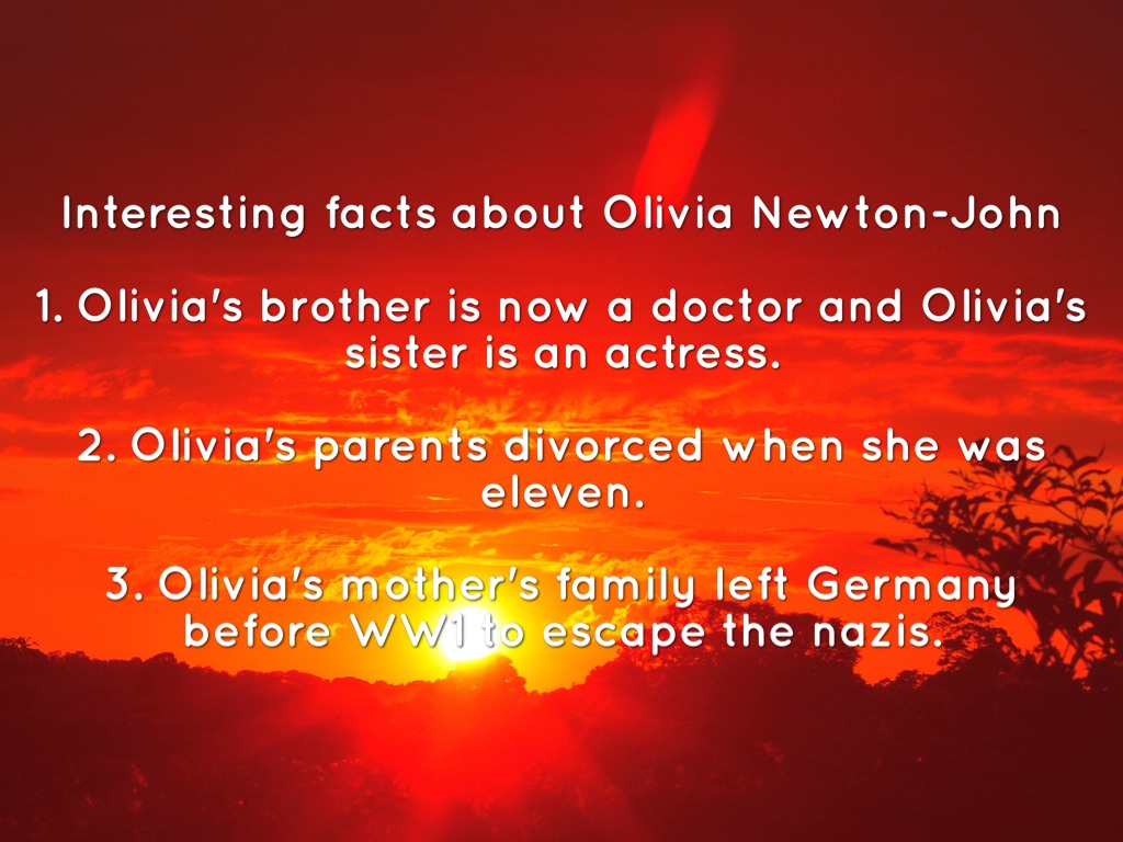 Olivia was the youngest in her 5 person family, Rona was Olivia's older sister and Hugh her older brother. Her father, Brinley Newton-John and her mother Irene Born. Olivia only had 1 child, Chloe-Rose Lattanzi who is now 28 years old.