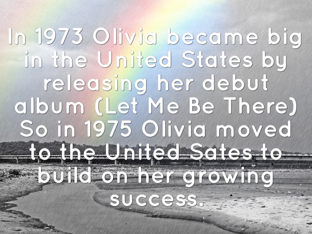 In 1973 Olivia became big in the United States by releasing her debut album (Let Me Be There) So in 1975 Olivia moved to the United Sates to build on her growing success.