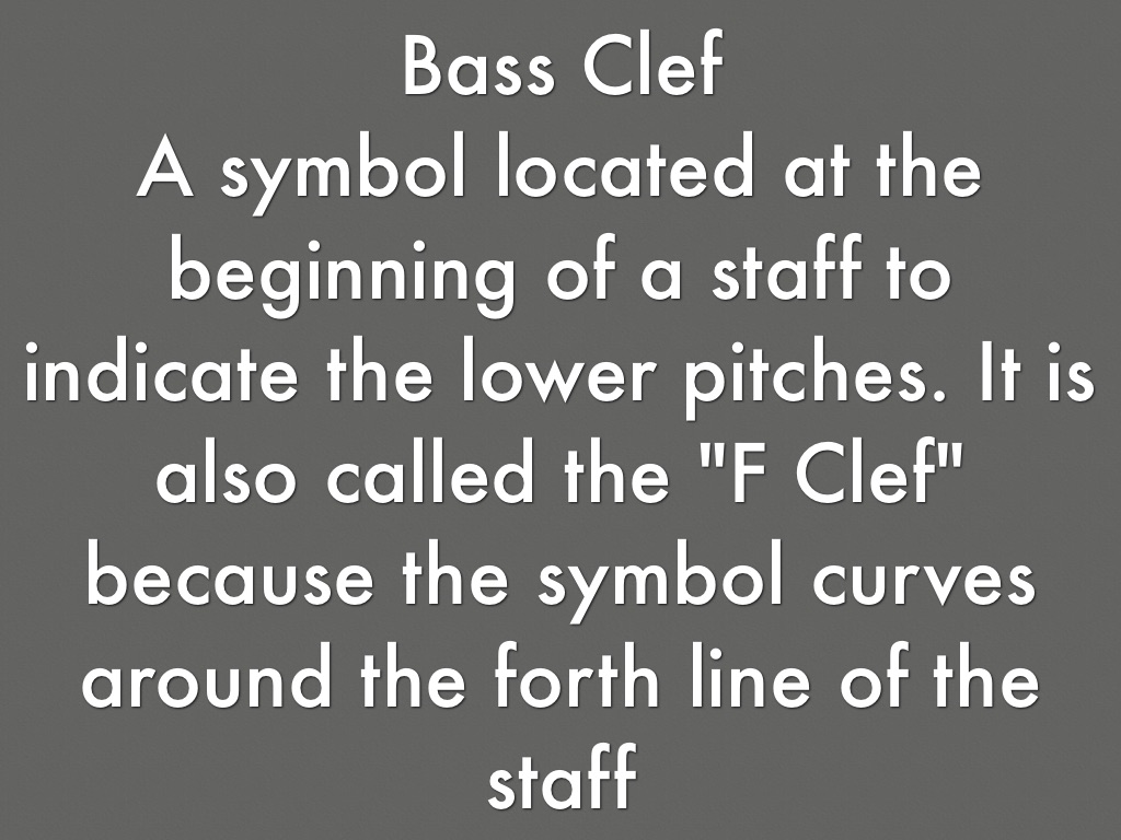 Bass Clef A symbol located at the beginning of a staff to indicate the lower pitches. It is also called the "F Clef" because the symbol curves around the forth line of the staff