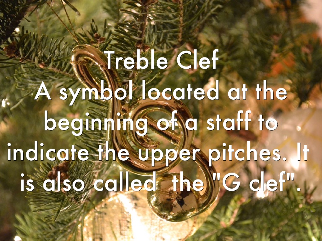 A symbol located at the beginning of a staff to indicate the upper pitches. It is also called the "G clef".