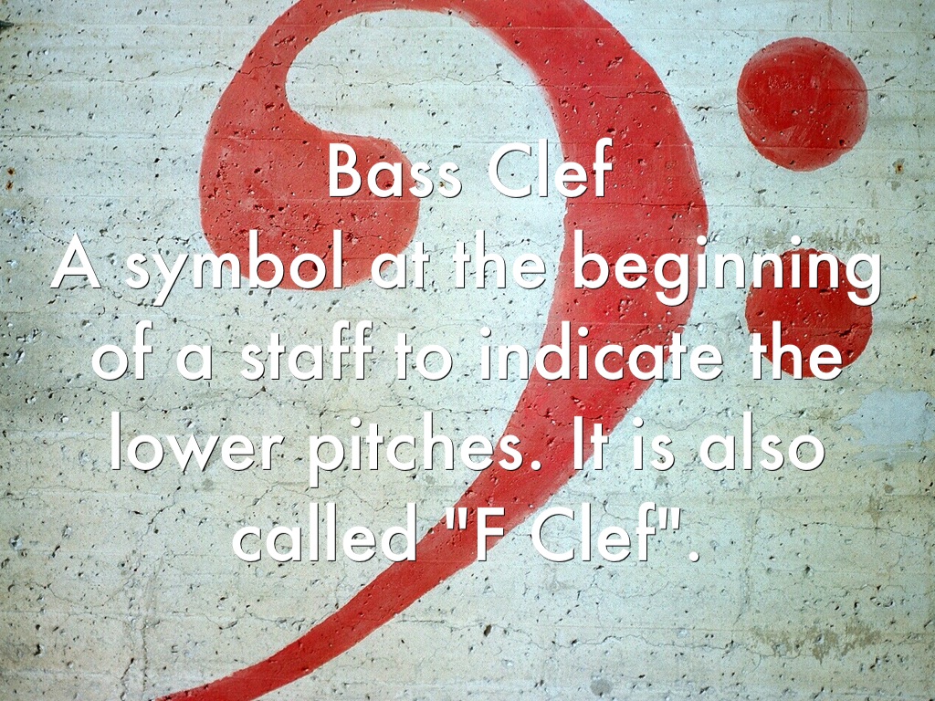 A symbol at the beginning of a staff to indicate the lower pitches. It is also called "F Clef".