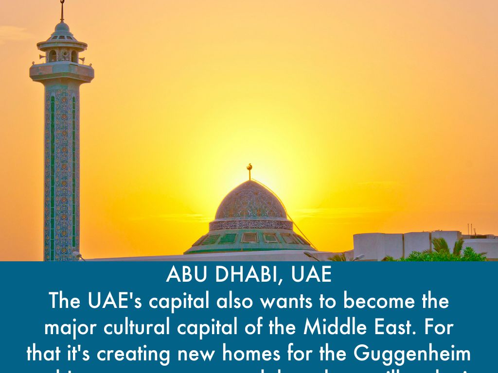 The UAE's capital also wants to become the major cultural capital of the Middle East. For that it's creating new homes for the Guggenheim and Louvre museums, and that alone will make it one of the world's must-go cities. Set in a series of islands, it's already an attractive destination, with sky-high architecture and one of the world's biggest mosques that may be visited by non-Muslims.