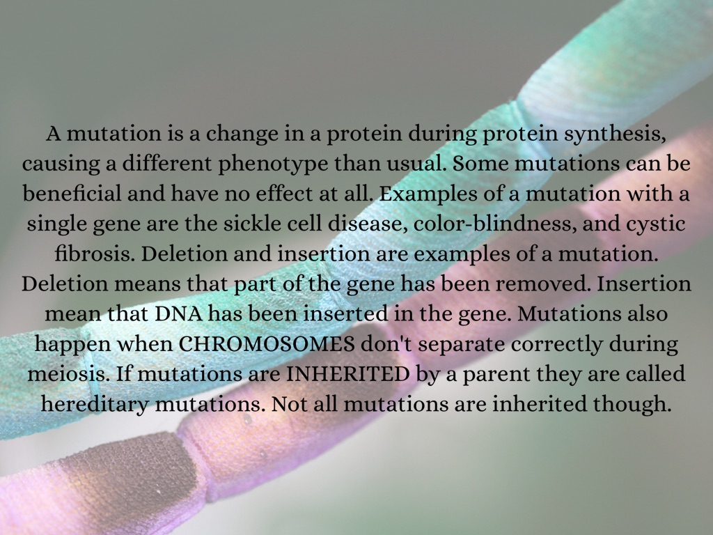 A mutation is a change in a protein during protein synthesis, causing a different phenotype than usual. Some mutations can be beneficial and have no effect at all. Examples of a mutation with a single gene are the sickle cell disease, color-blindness, and cystic fibrosis. Deletion and insertion are examples of a mutation. Deletion means that part of the gene has been removed. Insertion mean that DNA has been inserted in the gene. Mutations also happen when CHROMOSOMES don't separate correctly during meiosis. If mutations are INHERITED by a parent they are called hereditary mutations. Not all mutations are inherited though.
