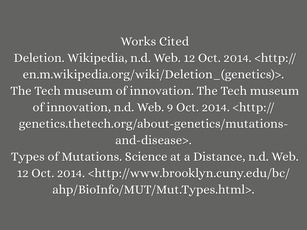 Works Cited Deletion. Wikipedia, n.d. Web. 12 Oct. 2014. . The Tech museum of innovation. The Tech museum of innovation, n.d. Web. 9 Oct. 2014. . Types of Mutations. Science at a Distance, n.d. Web. 12 Oct. 2014. .