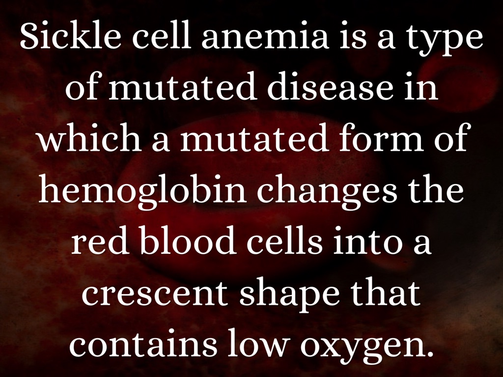 Sickle cell anemia is a type of mutated disease in which a mutated form of hemoglobin changes the red blood cells into a crescent shape that contains low oxygen.