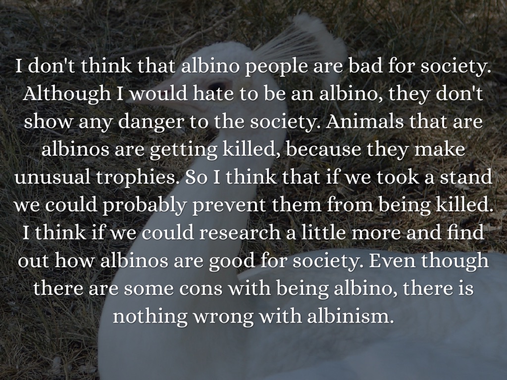 I don't think that albino people are bad for society. Although I would hate to be an albino, they don't show any danger to the society. Animals that are albinos are getting killed, because they make unusual trophies. So I think that if we took a stand we could probably prevent them from being killed. I think if we could research a little more and find out how albinos are good for society. Even though there are some cons with being albino, there is nothing wrong with albinism.