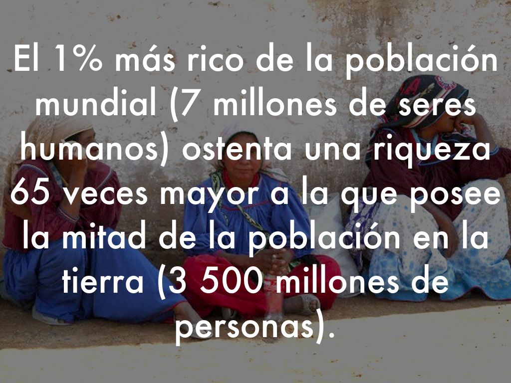 El 1% más rico de la población mundial (7 millones de seres humanos) ostenta una riqueza 65 veces mayor a la que posee la mitad de la población en la tierra (3 500 millones de personas).