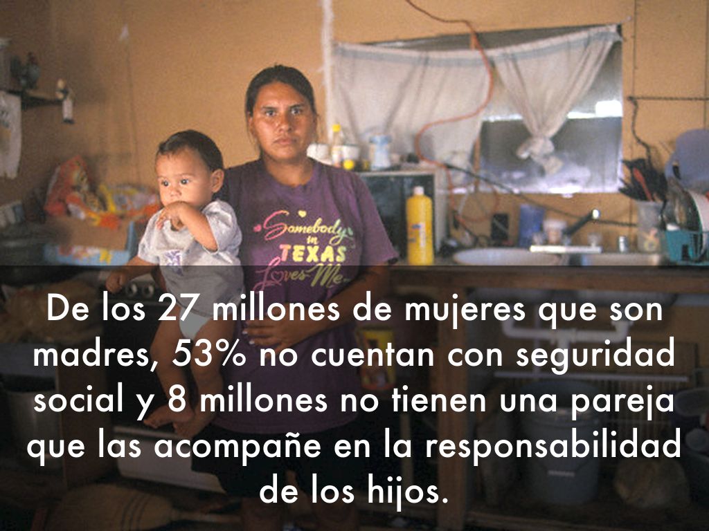 De los 27 millones de mujeres que son madres, 53% no cuentan con seguridad social y 8 millones no tienen una pareja que las acompañe en la responsabilidad de los hijos.