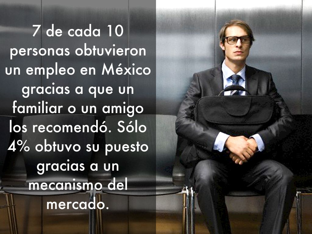 7 de cada 10 personas obtuvieron un empleo en México gracias a que un familiar o un amigo los recomendó. Sólo 4% obtuvo su puesto gracias a un mecanismo del mercado.