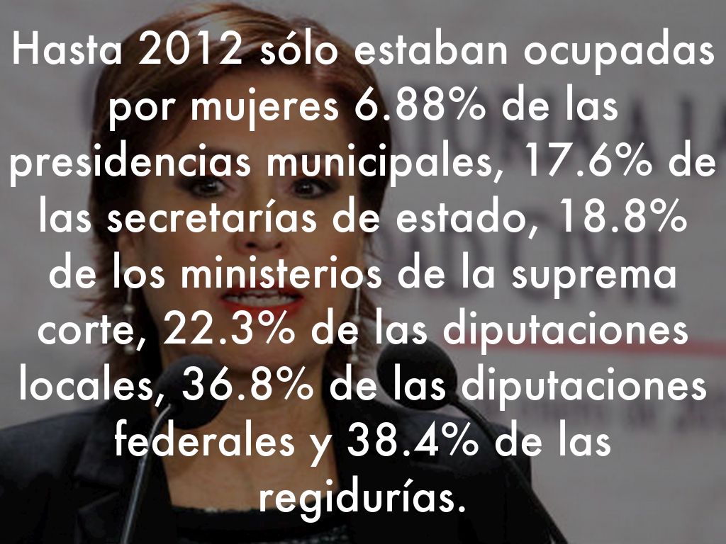 Hasta 2012 sólo estaban ocupadas por mujeres 6.88% de las presidencias municipales, 17.6% de las secretarías de estado, 18.8% de los ministerios de la suprema corte, 22.3% de las diputaciones locales, 36.8% de las diputaciones federales y 38.4% de las regidurías.
