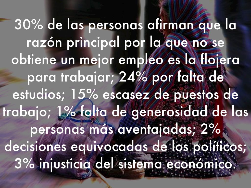30% de las personas afirman que la razón principal por la que no se obtiene un mejor empleo es la flojera para trabajar; 24% por falta de estudios; 15% escasez de puestos de trabajo; 1% falta de generosidad de las personas más aventajadas; 2% decisiones equivocadas de los políticos; 3% injusticia del sistema económico.