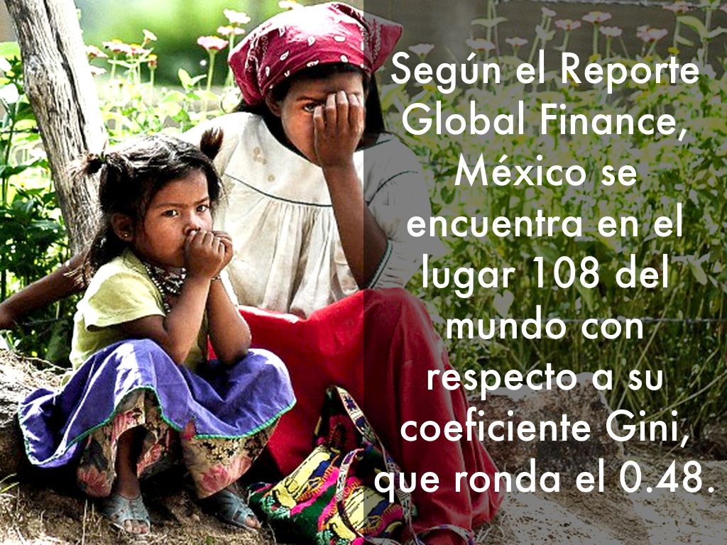 Según el Reporte Global Finance, México se encuentra en el lugar 108 del mundo con respecto a su coeficiente Gini, que ronda el 0.48.