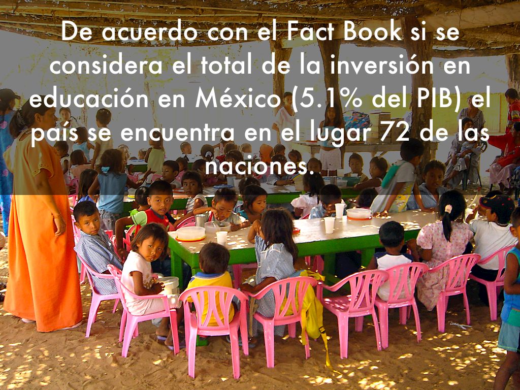 De acuerdo con el Fact Book si se considera el total de la inversión en educación en México (5.1% del PIB) el país se encuentra en el lugar 72 de las naciones.