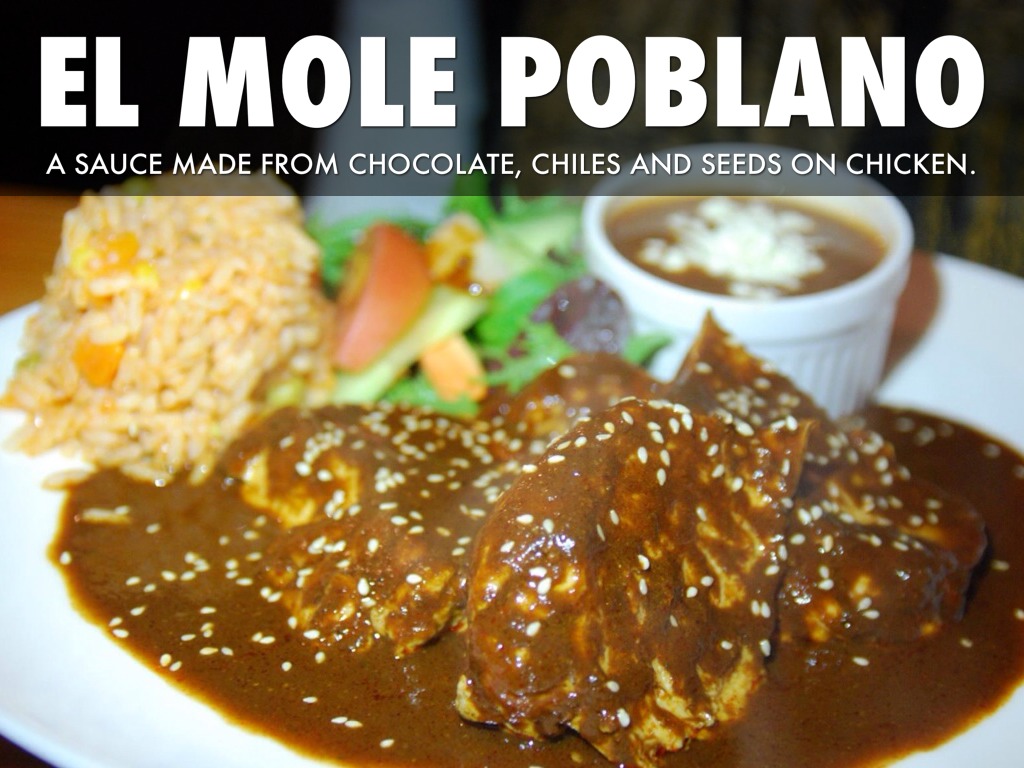 A SAUCE MADE FROM CHOCOLATE, CHILES AND SEEDS ON CHICKEN.