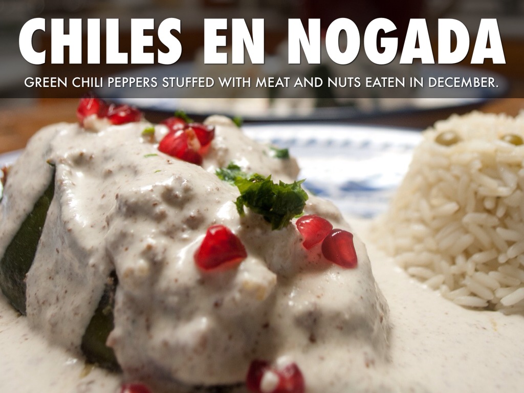 GREEN CHILI PEPPERS STUFFED WITH MEAT AND NUTS EATEN IN DECEMBER.