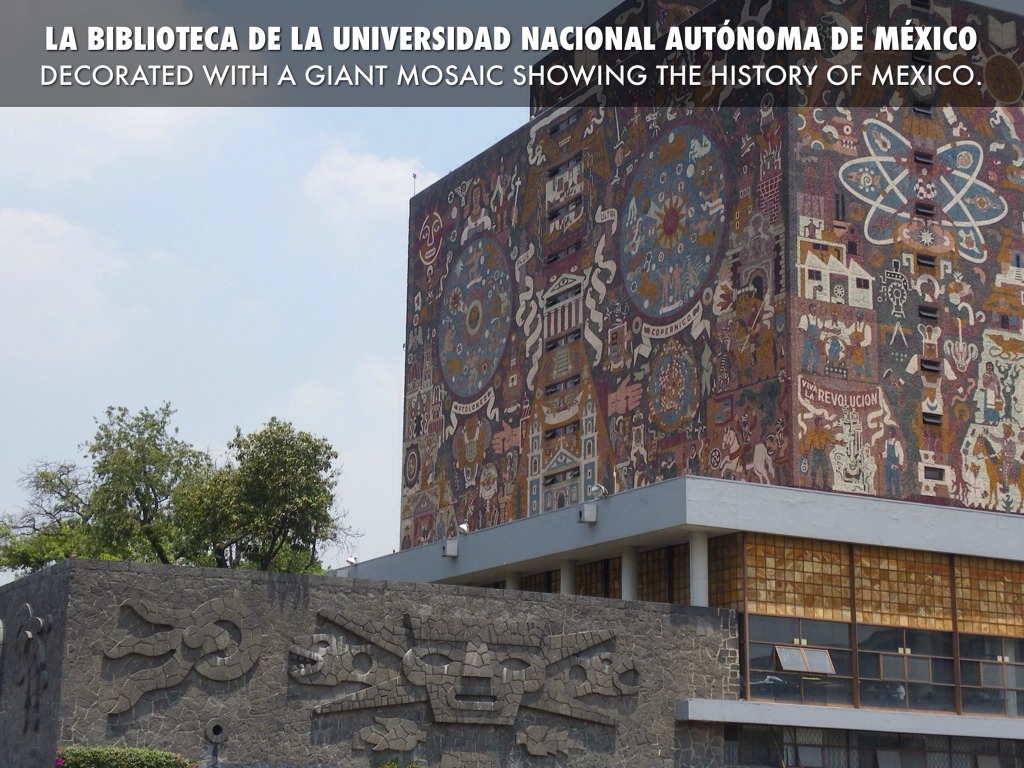 DECORATED WITH A GIANT MOSAIC SHOWING THE HISTORY OF MEXICO.