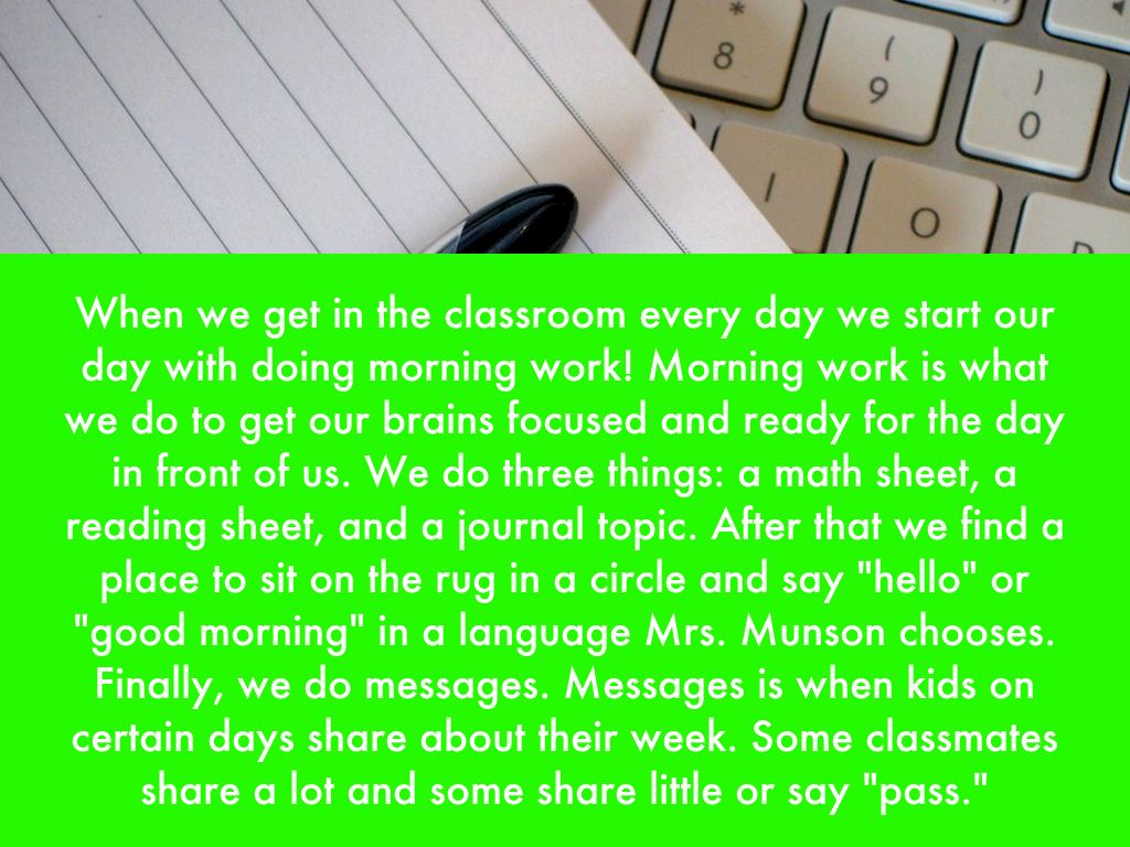 When we get in the classroom every day we start our day with doing morning work! Morning work is what we do to get our brains focused and ready for the day in front of us. We do three things: a math sheet, a reading sheet, and a journal topic. After that we find a place to sit on the rug in a circle and say "hello" or "good morning" in a language Mrs. Munson chooses. Finally, we do messages. Messages is when kids on certain days share about their week. Some classmates share a lot and some share little or say "pass."