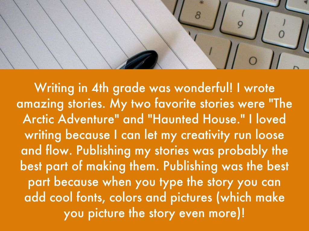 Writing in 4th grade was wonderful! I wrote amazing stories. My two favorite stories were "The Arctic Adventure" and "Haunted House." I loved writing because I can let my creativity run loose and flow. Publishing my stories was probably the best part of making them. Publishing was the best part because when you type the story you can add cool fonts, colors and pictures (which make you picture the story even more)!