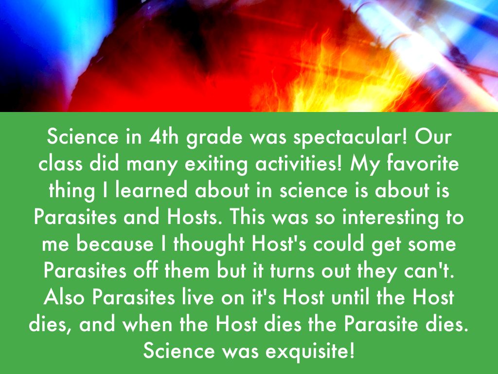 Science in 4th grade was spectacular! Our class did many exiting activities! My favorite thing I learned about in science is about is Parasites and Hosts. This was so interesting to me because I thought Host's could get some Parasites off them but it turns out they can't. Also Parasites live on it's Host until the Host dies, and when the Host dies the Parasite dies. Science was exquisite!