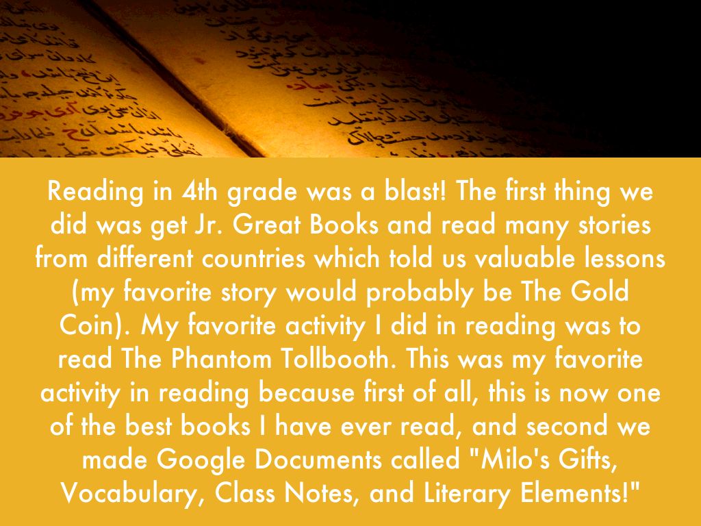 Reading in 4th grade was a blast! The first thing we did was get Jr. Great Books and read many stories from different countries which told us valuable lessons (my favorite story would probably be The Gold Coin). My favorite activity I did in reading was to read The Phantom Tollbooth. This was my favorite activity in reading because first of all, this is now one of the best books I have ever read, and second we made Google Documents called "Milo's Gifts, Vocabulary, Class Notes, and Literary Elements!"